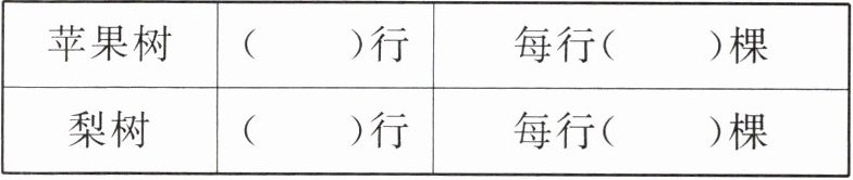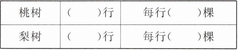 3. 某果园里栽了18行桃树、24行苹果树和20行梨树,桃树每行32棵,苹果树每行40棵,梨树每行36棵。根据下面的问题先列表整理,再列式解答。