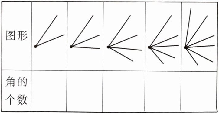解析:每两条射线可以组成一个角。2条射线组成1个角;3条射线组成的角有2+1=3(个);4条射线组成的角有3+2+1=6(个);5条射线组成的角有4+3+2+1=10(个);6条射线组成的角有5+4+3+2+1=15(个)。