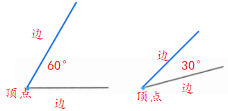 2. 以下面的两条射线为边,分别画出60°、30°的角,并指出每个角的顶点和边。