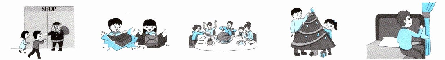 1. turkey 2. presents 3. Father 4. tree 5. stocking
