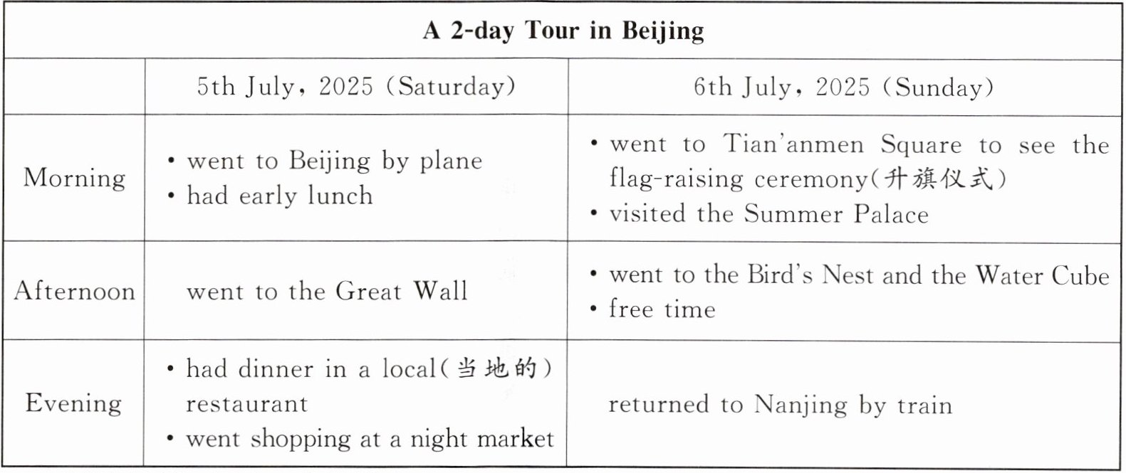 Peter and his family went to Beijing for the summer holiday. Here's their tour schedule(旅游行程).