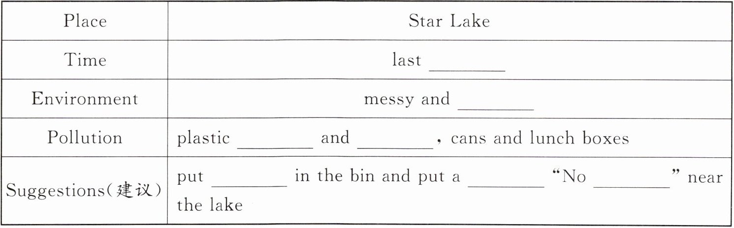 We went to Star Lake last year. The lake was messy and dirty. What made the lake messy? There were a lot of plastic bags,plastic bottles,cans and lunch boxes. The pollution was serious(严重的). The fish were dead too. To keep the lake clean,we should put rubbish in the bin and put a sign "No littering" near the lake. We shouldn't litter anywhere. Everyone should know this and protect the lake. This year,Star Lake becomes more beautiful. We are happy to see that.