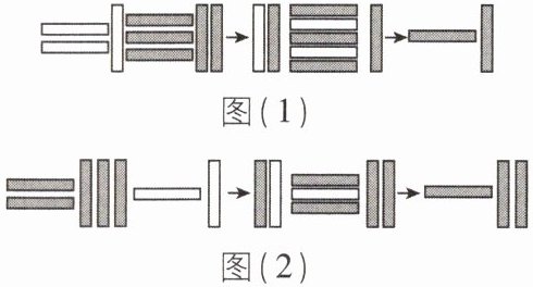 8 新考向传统文化[2025 江苏徐州期中]魏晋时期数学家刘徽在其著作《九章算术注》中用不同颜色的算筹(小棍形状的记数工具)分别表示正数和负数(白色为正,灰色为负),图(1)表示的是算式$(+21) + (-32) = -11$,则图(2)表示的算式是(