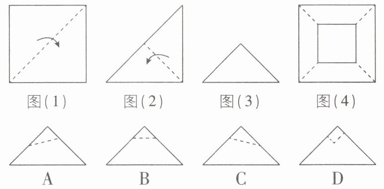 1 [2025江苏淮安质检]将一张正方形纸片依次沿图(1)、图(2)的虚线对折,得到图(3)所示的三角形,然后剪去一个角,展开铺平后的图形如图(4)所示,则正确的剪法是(