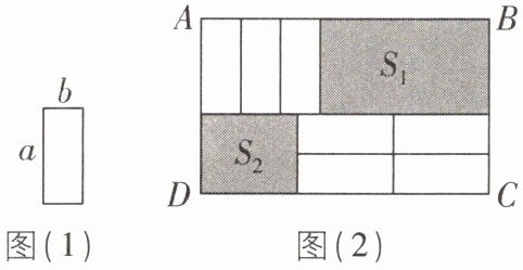(2)有7个如图(1)所示的小长方形,其长为$a$,宽为$b$,按照图(2)方式不重叠无缝隙地放在大长方形$ABCD$内,大长方形中未被覆盖的两个部分(图中阴影部分)中,设右上角的面积为$S_{1}$,左下角的面积为$S_{2}$,当$AB$的长变化时,$S_{1}-S_{2}$的值始终保持不变,求$a与b$的等量关系.