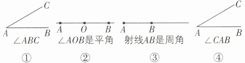 4.②④ [解析]①表示的角为∠BAC(或∠CAB或∠A),故错误;②表示的角为平角∠AOB,故正确;③射线AB不是周角,故错误;④表示的角为∠CAB(或∠BAC或∠A),故正确。故答案为②④.