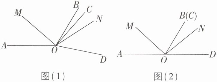(3)$∠COD$从图(2)中的位置绕点O顺时针旋转$n^{\circ}(0 < n < 120且n \neq 60)$,直接写出所有使$∠MON = 2∠BOC$的n值.
