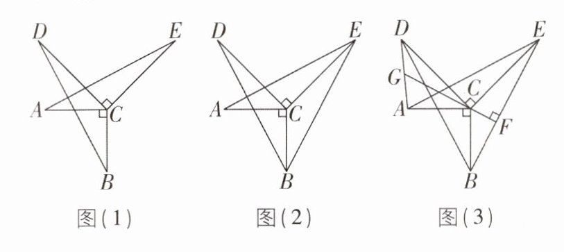 (3)如图(3),连接$AD$,$BE$,过点$C作CF⊥BE于点F$,延长$FC交AD于点G$,求证:点$G是AD$的中点。