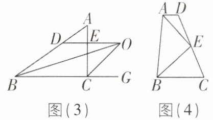 (2)【类比探究】如图(3),$\triangle ABC$中,内角$∠ABC与外角∠ACG的平分线交于点O$,过点$O作OD// BC分别交AB$,$AC于点D$,$E$,试探究线段$BD$,$DE$,$CE$之间的数量关系并说明理由.