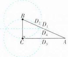 C 方法技巧:“两圆一中垂”构造等腰三角形。已知两点A,B,找C点使得△ABC为等腰三角形:分类讨论:若AB = AC,则点C在以点A为圆心,线段AB的长为半径的圆上;若BA = BC,则点C在以点B为圆心,线段AB的长为半径的圆上;若CA = CB,则点C在线段AB的垂直平分线上。以上简称“两圆一中垂”。“两圆一中垂”上的点能构成等腰三角形,但是要除去原有的点A,B,还要除去因共线无法构成三角形的点M,N,以及线段AB的中点E(共除去5个点)。[解析]如图,①以BC为腰时,以B为圆心、BC长为半径画圆,与AB有一个交点D₁;以C为圆心、BC长为半径画圆,与AB有一个交点,与AC有一个交点,分别为D₂,D₃。②以BC为底时,作BC的垂直平分线,与AB有一个交点D₄。综上可知,点D的位置有4个,故选C。