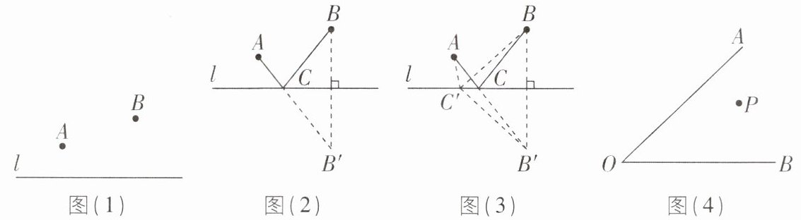 小亮:如图(3),在l上另取一点C',连接AC',BC',B'C',只要证明AC+CB<AC'+C'B即可.请写出小亮的证明过程.