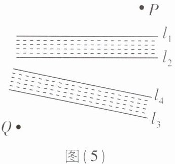 任务二:如图(5)所示,在P,Q两村之间有两条河,且每条河的宽度处处相等,从P村前往Q村,要经过这两条河.现在要在这两条河上分别造一座垂直于河岸的桥EF,MN,则这两座桥EF,MN造在何处可使由P村到Q村的路程最短?(要求在图上标出道路和大桥的位置)