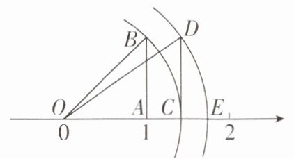 6[2025山西临汾期末]如图所示,点O为数轴的原点,点A在数轴上表示1,作腰长为1的等腰直角三角形OAB,其中$∠OAB= 90^{\circ }$,以点O为圆心,OB长为半径作弧,交数轴于点C,作直角三角形OCD,其中$∠OCD= 90^{\circ },CD= 1$,以点O为圆心,OD长为半径作弧,交数轴于点E,则点E表示的实数为