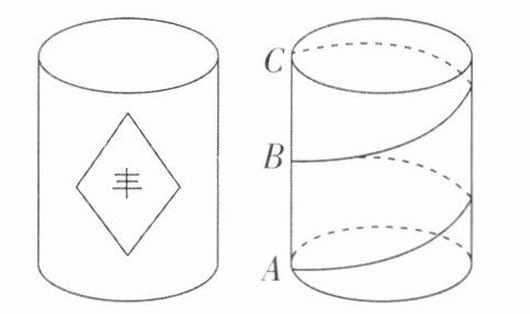 6 新素材[2025山西晋中期末]2024年9月22日是第七届中国农民丰收节,小彬用3D打印机制作了一个底面周长为20cm,高为30cm的圆柱形粮仓模型,如图,现要在此模型的侧面贴彩色装饰带,使装饰带从柱底沿圆柱表面均匀地缠绕2圈到达柱顶正上方(从点A到点C,B为AC的中点),则装饰带的长度最短为( )