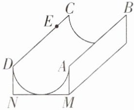 2 [2025 江苏南通期末,中]如图是一个供滑板爱好者使用的 U 型池的示意图,该 U 型池可以看作是一个长方体去掉一个“半圆柱”而成,中间可供滑行部分的竖直截面是半径为 4 m 的半圆,其边缘$AB= CD= 20m$,点 E 在 CD 上,$CE= 4m$,一滑行爱好者从 A 点滑到 E 点,则他滑行的最短距离是多少?(边缘部分的厚度可以忽略不计,π取 3)