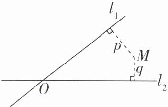 6 新考法 [2025 江苏常州期中,较难]如图,平面中两条直线$l_{1}和l_{2}相交于点O$,对于平面上任意一点$M$,若点$M到直线l_{1}$,$l_{2}的距离分别是p\ cm$,$q\ cm$,则称有序实数对$(p,q)是点M$的“距离坐标”. 特别地,当点在直线上时,定义点到直线的距离为 0. 下列说法: