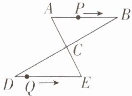 4 [2025 江苏连云港期末,中]如图,AE 与 BD 相交于点 C,AC= EC,BC= DC,AB= 4cm,点 P 从点 A 出发,沿 A→B→A 方向以 3cm/s 的速度运动,点 Q 从点 D 出发,沿 D→E 方向以 1cm/s 的速度运动,P,Q 两点同时出发,当点 P 返回到点 A 时,P,Q 两点同时停止运动. 设点 P 的运动时间为 t s. 连接 PQ,当线段 PQ 经过点 C 时,求 t 的值.