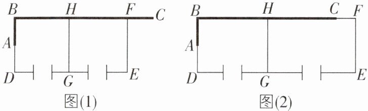 4 [2024 浙江湖州长兴期中,中]某牧场准备利用现成的一堵“7”字形的墙面(粗线 A - B - C 表示墙面)建饲养场,已知 AB ⊥ BC,AB = 3 米,BC = 15 米,现计划用总长为 38 米的篱笆围建一个“日”字形的饲养场 BDEF,并在每个区域开一个宽 2 米的门,如图(细线表示篱笆,饲养场中间用篱笆 GH 隔开),点 F 可能在线段 BC 上,也可能在线段 BC 的延长线上。
