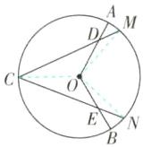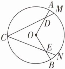 (2)如图,连接OM,ON;$\because \triangle COD\cong \triangle COE$,$\therefore ∠CDO = ∠CEO$,$∠OCD = ∠OCE$。$\because OC = OM = ON$,$\therefore ∠OCM = ∠OMC$,$∠OCN = ∠ONC$,$\therefore ∠OMD = ∠ONE$。$\because ∠ODC = ∠DMO + ∠MOD$,$∠CEO = ∠CNO + ∠EON$,$\therefore ∠MOA = ∠NOB$,$\therefore \overset{\frown }{AM}=\overset{\frown }{BN}$。