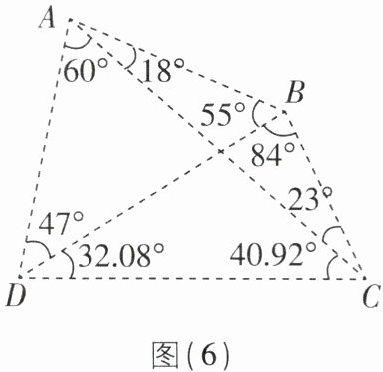 某地有四个村庄 $ A $,$ B $,$ C $,$ D $(其位置如图(6)所示),现拟建一个 5G 网络信号中转站,为了使这四个村庄的居民都能接收到信号,经过工程人员测量得到 $ CD = 8\ \text{km} $ 及图中标注的相关数据,则四边形 $ ABCD $ 区域最小覆盖圆的半径为______。