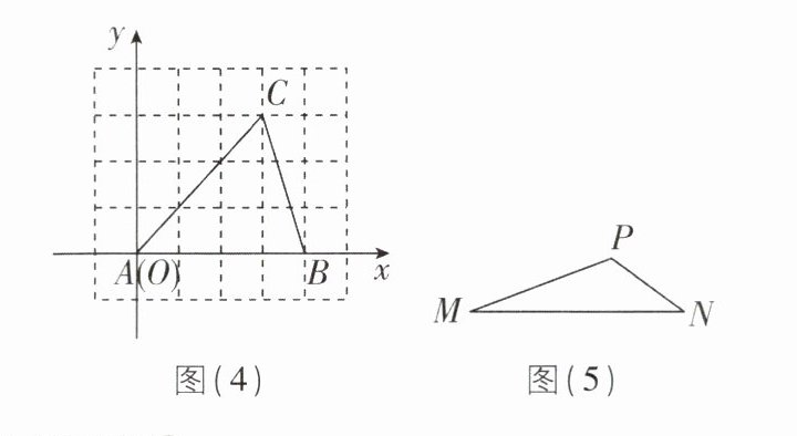 (2)如图(4),在正方形组成的网格中建立平面直角坐标系,$ \triangle ABC $ 的顶点 $ A $ 位于坐标原点,顶点 $ B $,$ C $ 的坐标分别为 $ (4,0) $,$ (3,3) $,则 $ \triangle ABC $ 的最小覆盖圆的圆心坐标为______,半径长为______;如图(5),钝角 $ \triangle MNP $ 中,$ MN = 5 $,$ \angle MPN = 123^{\circ} $,则 $ \triangle MNP $ 的最小覆盖圆的半径长为______。