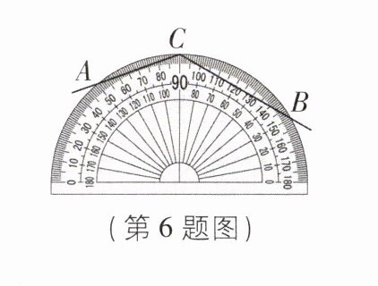 6[2025浙江宁波期中]在利用量角器测量$∠ACB$的度数时,小文同学放错了位置,将角的顶点放到了量角器的弧线上(如图),爱思考的李涛同学忽然发现,这样测量也能得到$∠ACB$的度数.通过仔细观察,李涛同学发现射线CA,CB与量角器的交点A和B对应的刻度分别是$50^{\circ }和150^{\circ }$,则$∠ACB$的度数为______.