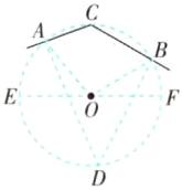 130°【解析】根据题意构造$\odot O$,在下半圆上取点 D,连接 OA,OB,DA,DB,设$\odot O$的直径为 EF,如图。由题意可知,$∠AOE = 50^{\circ}$,$∠EOB = 150^{\circ}$,$\therefore ∠AOB = ∠EOB - ∠AOE = 150^{\circ}-50^{\circ}= 100^{\circ}$,$\therefore ∠ADB = \frac{1}{2}∠AOB = 50^{\circ}$。