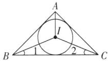 ∴点I到△ABC三边的距离相等. 设点I到△ABC三边的距离为h,则$S_{\triangle IBC}$= $\frac{1}{2}BC\cdot h$,$S_{\triangle IAB}+S_{\triangle IAC}$= $\frac{1}{2}AB\cdot h+\frac{1}{2}AC\cdot h$= $\frac{1}{2}(AB+AC)\cdot h$.
