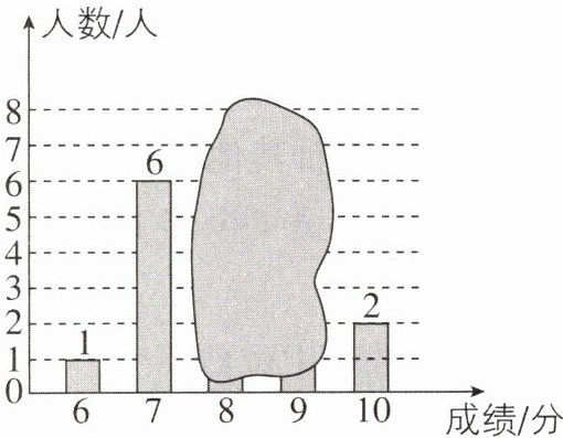 6 [2025 河北承德调研,中]某班 20 名学生 800 米跑的测试成绩(满分 10 分)条形统计图如图所示,得 8 分和 9 分的人数被污渍遮盖,设得 8 分的学生有 a 人,得 9 分的学生有 b 人。