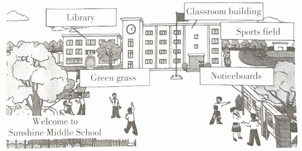 I study in Sunshine Middle School. Our school is big and nice.When you enter it, you can see green grass on the left. Noticeboards on the right tell us about school events and clubs. There's a sports field next to the classroom building, where we play football and basketball. I love playing basketball there! The library is next to the classroom building too. It has many books, and we can borrow one for two weeks. I like reading quietly there.My school is the best place to study and have fun in my eyes!