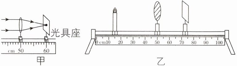 cm。(3)如图乙所示,将凸透镜固定在光具座上50 cm刻度线处,把点燃的蜡烛放置在光具座上15 cm处,通过移动光屏,能成倒立、