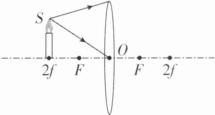 7 [2025陕西西安质检,中]如图所示,点燃的蜡烛恰好在凸透镜的二倍焦距处,烛焰S点发出的两条光线已在图中画出,O为凸透镜的光心,F为凸透镜的焦点。请在图中作出:S的像点$S'$,并完成光路。