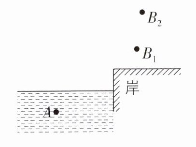 4 [中]如图所示,潜水员的眼睛在水面以下A处,从水中观察岸上的物体。图中的$B_{1}和B_{2}$分别是物、像的位置,请在图中作出潜水员观察物体的光路图。