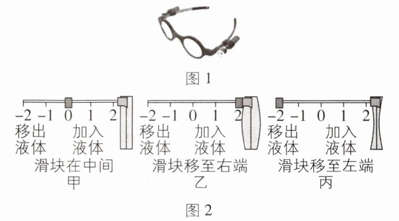 6 [2025新疆乌鲁木齐期末,中]如图1所示,一项被称作“可调式眼镜”的新技术可以帮助人们不用通过眼科医生就可以矫正自己的视力。这种眼镜的镜片中含有一种液体,通过调节此液体的含量,镜片的形状会随之改变;如图2所示,改变滑块的位置就可实现镜片形状的变化。