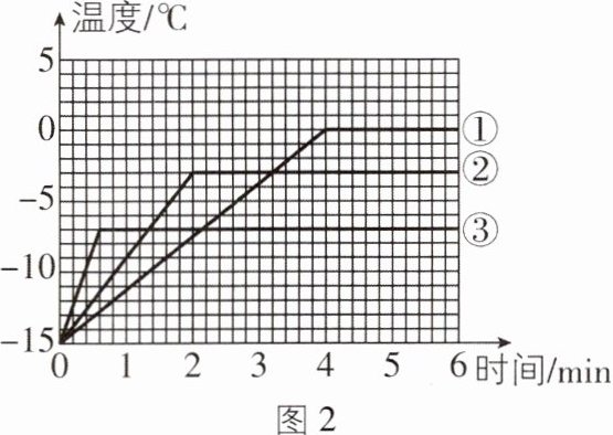 (2)在相同条件下测量三者的温度变化,得到三条温度变化图线,如图 2(纯冰对应图线①、淡盐冰对应图线②、浓盐冰对应图线③)。