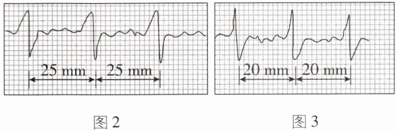 75 25 [解析]被检者甲的心率为60次/min,即被检者甲平均1s心脏跳动1次,结合图2可知经过1s心电图仪输出坐标纸的长度是25mm,则输出坐标纸的速度$v = \frac{s}{t} = \frac{25mm}{1s} = 25mm/s$;同一台心电图仪出纸速度v相同,由图3可知被检者乙每完成1次心跳坐标纸运动的路程$s' = 20mm$,由$v = \frac{s}{t}$可知乙每次心跳的时间间隔$t' = \frac{s'}{v} = \frac{20mm}{25mm/s} = 0.8s$,故被检者乙1min心跳的次数$n = \frac{60s}{0.8s} = 75$,即被检者乙的心率为75次/min。