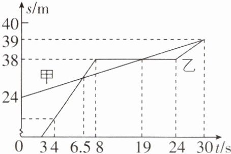 AB [解析]在s - t图像中,两图线的交点表示到参考点的距离相等,也就是不同物体相遇的位置,t = 6.5s、19s、30s时两图线相交,说明甲、乙共相遇3次;3~6.5s时间内,甲运动的路程小于乙运动的路程,由$v = \frac{s}{t}$可知,甲的速度小于乙的速度;在8~24s时间内,乙没有运动,速度为0,但甲在运动,两者速度不相等;在19~30s的时间内,甲、乙运动的路程都是$s = 39m - 38m = 1m$,运动时间相等,因而这段时间内两者的平均速度相等。故选AB。