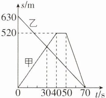 B [解析]由图可知,乙做匀速直线运动,乙的速度$v_{乙} = \frac{s_{乙}}{t_{乙}} = \frac{630m}{70s} = 9m/s$,则乙在0~20s内的速度为9m/s,甲在0~40s内做匀速直线运动,速度为$v_{甲} = \frac{s_{甲}}{t_{甲}} = \frac{520m}{40s} = 13m/s$,则甲在0~20s内的速度为13m/s,所以,在0~20s内,甲车比乙车的平均速度大,故A正确;根据以上计算可知,甲在第30s时的速度为13m/s,乙在第30s时的速度为9m/s,所以在第30s时,甲、乙两车的速度大小不相等,故B错误;由图可知,甲在第45s时处于静止状态,而乙做匀速直线运动,由于甲出发时向东运动,则乙出发时向西运动,故在第45s时,乙车相对于甲车向西运动,故C正确;由图可知,甲在50~70s内的速度$v_{甲}' = \frac{s_{甲}'}{t_{甲}'} = \frac{520m}{20s} = 26m/s$,由于甲在50~70s内做匀速直线运动,故甲在50~60s内的速度为26m/s,所以在50~60s内,甲车比乙车的平均速度大,故D正确。故选B。