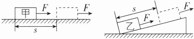 2 [2024 陕西咸阳期末]现有甲、乙两个质量不同的物体($m_{甲}>m_{乙}$),在相等的恒力$F$作用下,分别在水平方向、沿斜面向上通过了相等的距离$s$,如图所示。$F在两种情况下做的功分别为W_{甲}$、$W_{乙}$,两者大小判断正确的是( )