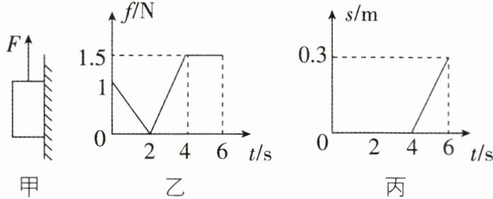2 [2025 江苏泰州期末,中]如图甲所示,一磁性板擦静止吸附在黑板上,对其施加方向始终向上的拉力$F$,板擦最终向上运动。过程中板擦所受摩擦力$f与时间t的关系图像和板擦移动距离s与时间t$的关系图像分别如图乙、丙所示,下列说法正确的是( )
