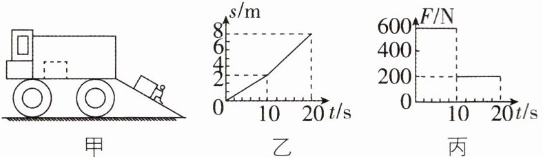 3 [2025江苏南京期末,中]如图甲所示,工人用推力F将重为1000N的箱子(忽略箱子的体积)沿斜面推至水平车厢中,斜面长3m、高1.5m,F的方向始终与箱子运动方向相同。箱子运动的路程随时间变化的情况如图乙所示,推力F随时间变化的情况如图丙所示。下列分析正确的是(