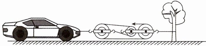 4[2025辽宁盘锦期末,中]一辆质量为$1.2×10^{3}kg$的汽车陷入一泥泞路段,司机师傅利用滑轮组和周围条件,组装成了如图所示的拖车装置,已知汽车通过泥泞路段需移动15m的距离,汽车在泥泞路段受到的阻力为车重的$\frac {1}{10}$,滑轮组的机械效率为80%,g取10N/kg。在将车匀速拖离泥泞路段的过程中,求: