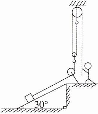 6[2025陕西西安期中,中]工人用如图所示的装置把重力G= 1000N的物体(忽略物体体积),从斜面底部刚好匀速拉到h= 2m高的平台上(斜面与水平地面的夹角为30°),用时t= 20s。工人对绳子的拉力为F= 400N,动滑轮的重力G₀= 20N,不考虑绳重和滑轮转轴的摩擦,求: