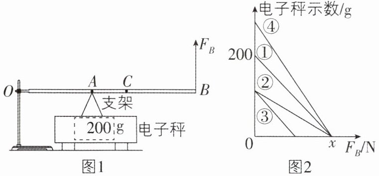6 [2024江苏镇江期末,偏难]如图,电子秤上支架质量不计,均匀细木棒OAB可绕O点自由转动,当支架支撑在A点时,调节O点高度,使木棒水平平衡,此时电子秤示数如图1所示,已知OA:OB= 2:5,细木棒的自重为______N。现在B点施加竖直向上的拉力F_B,电子秤示数与F_B的关系图线为图2中的①,则图像中横坐标x点对应的数值为______。若将支架从A点移至C点,电子秤示数与F_B的关系图线变为图2中的______(填数字序号)。(g取10N/kg)