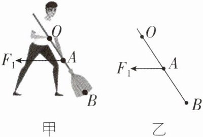 5 [2025江苏徐州质检,中]爱学习爱劳动,小张经常做家务。如图甲是小张用笤帚在水平地面扫地时的情景,如图乙是他用笤帚扫地时的简化图,O为支点,作用在A点的力$F_1$为动力。请在图乙中画出力$F_1$的力臂$L_1$及作用在笤帚上B点的阻力$F_2$的示意图。
