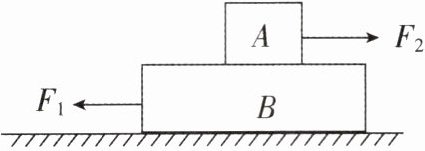 5[2024四川南充中考,中]如图所示,木板B置于水平地面上,物块A叠放于B上。水平拉力$F_{1}= 70N$,水平拉力$F_{2}= 50N$。B静止,A沿木板B以10cm/s的速度向右匀速滑动。则拉力$F_{2}$的功率为