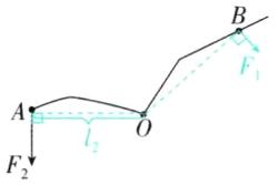 【解析】过支点O作到阻力$F_{2}$的垂线,可得阻力臂$l_{2}$;由杠杆平衡条件可知,在阻力跟阻力臂的乘积一定时,动力臂越长,动力越小;图中支点在O点,因此OB作为动力臂$L_{1}$最长;动力的方向应该向下,过点B垂直于OB向下作出最小动力$F_{1}$的示意图。