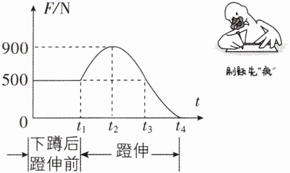 3[2025陕西汉中期末,中]立定跳远可分解为下蹲、蹬伸和腾空三个过程。如图为小明立定跳远过程中所受地面支持力F随时间t变化的图像。由图可知小明受到的重力为