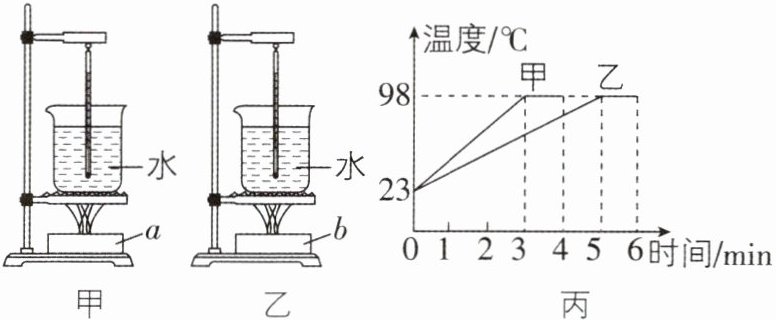 5[2025江苏南京期中,偏难]如图甲、乙所示,相同烧杯内装有质量相等的水,分别用a、b两种燃料进行加热,燃料完全燃烧的质量分别为m_a、m_b,且m_a:m_b= 2:1。此过程中,甲、乙两图烧杯中水的温度与加热时间的关系如图丙所示,若同一杯水单位时间内吸收的热量相同,不计热量损失和水质量的变化,则下列说法正确的是(