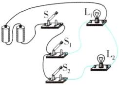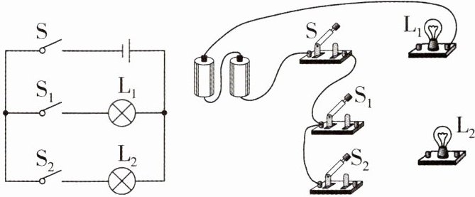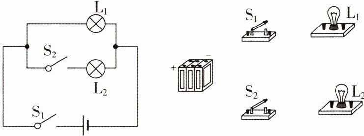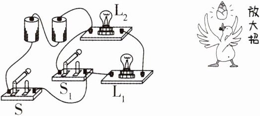 8[2025内蒙古呼和浩特期末,中]如图所示的实物电路中,当开关都闭合后,会出现短路现象。只改动一根导线,使两灯并联,开关S控制干路,$S_{1}控制灯L_{1}$。在需改动的线上打“×”,用笔画出正确接法。